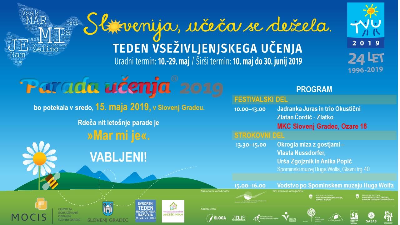 Parado učenja – Dan učečih se skupnosti, ki danes poteka v Slovenj Gradcu, v okviru Tedna vseživljenjskega učenja, so zaznamovali s sloganom – »Mar mi je.« Del dogodkov se je že odvil, še vedno pa imate možnost, da se pridružite organizatorjem, ki so za obiskovalce pripravili bogat večgeneracijski program. Sicer je bilo prvotno mišljeno, da bo dopoldansko dogajanje potekalo na prostem, ampak so ga zaradi slabega vremena prestavili v v Mladinski kulturni center Slovenj Gradec.