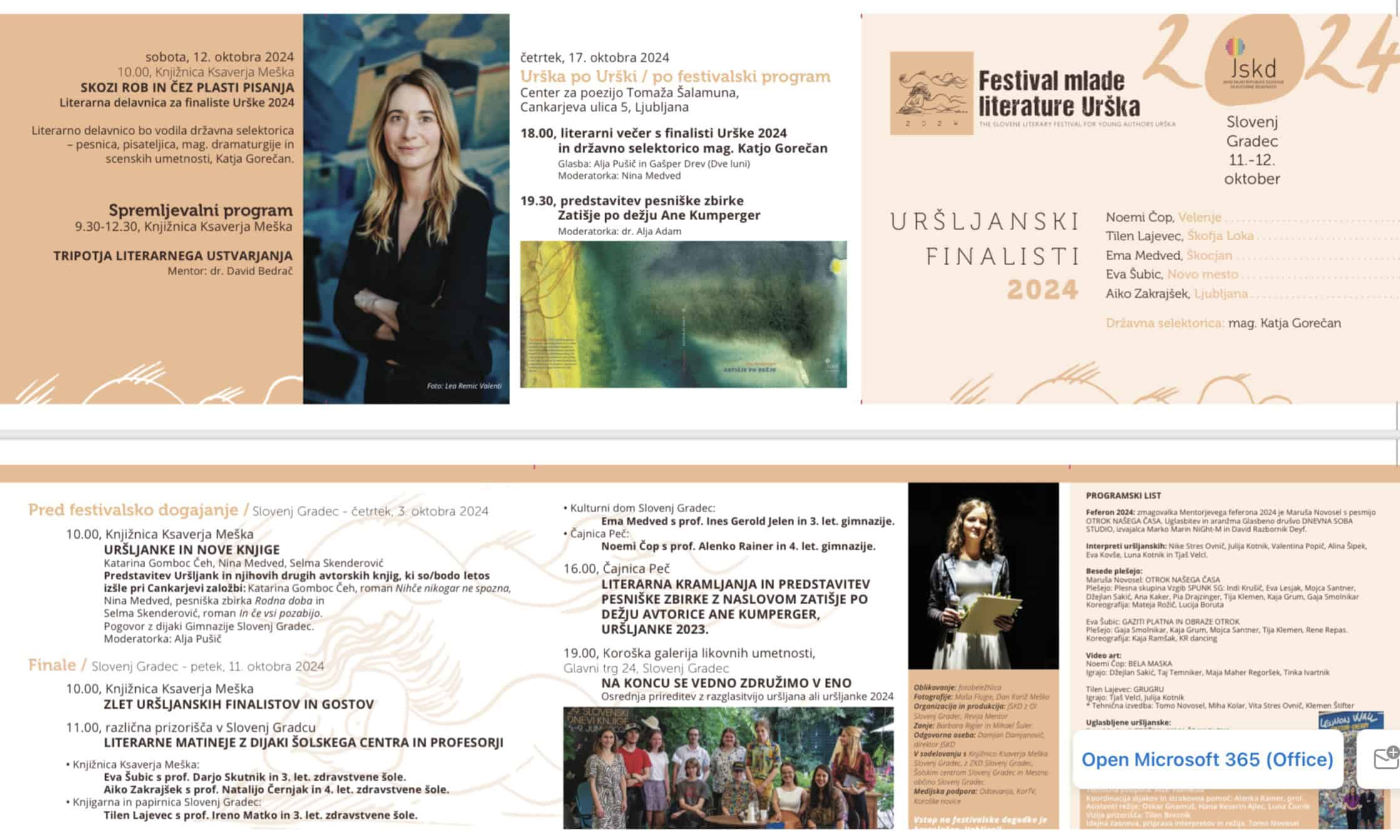 Državna selektorica, pesnica, pisateljica in dramaturginja ter nominiranka za kresnika 2023, mag. Katja Gorečan, je za finale Festivala mlade literature Urška 2024 izbrala pet finalistov; Emo Medved, Noemi Čop, Evo Šubic, Tilna Lajevca in Aiko Zakrajšek. V okviru finalne prireditve bo JSKD podelil tudi nagrado za najboljšo protestno pesem Mentorjev feferon 2024.