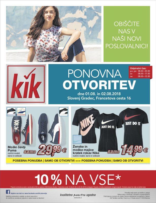 Trgovina KiK Slovenj Gradec, na Francetovi cesti 16 znova odpira svoja vrata v sredo 1. avgusta. Za obiskovalce bodo poskrbeli s številnimi presenečenji. Pričakale jih bodo hostese in jih popeljale skozi dogajanje v trgovini in jim ponudile možnost sodelovanja v KiK-ovi nagradni igri.