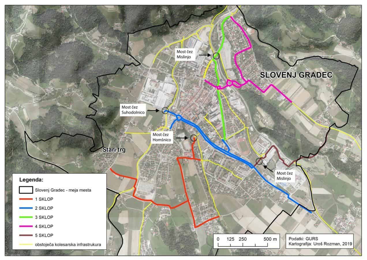 Projekt je razdeljen na pet sklopov, dela pa so pričeli izvajati najprej na prvem sklopu, ki po navedbah občine zajema ureditev kolesarske povezave Šolskega centra Slovenj Gradec ter l. in lll. OŠ na kolesarsko omrežje Slovenj Gradca. Kolesarska povezava je razdeljena na štirinajst odsekov v skupni dolžini okrog 2,5 km. Z njo bodo povezali območje Šolskega centra Slovenj Gradec ter Prve in Tretje OŠ s centrom mesta in stanovanjsko sosesko S8, z območjem Toplarne, s kolesarsko stezo v smeri Podgorja, pokopališča, kolesarsko povezavo ob Suhodolnici ter s Starim trgom.