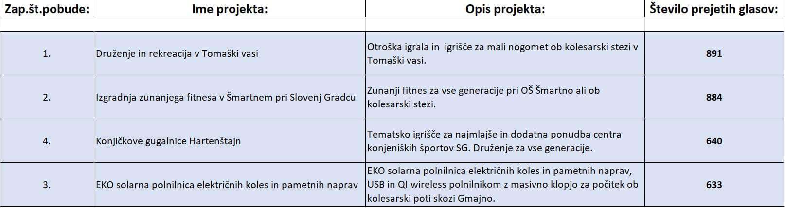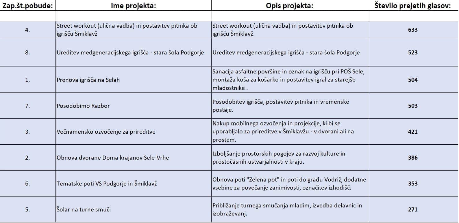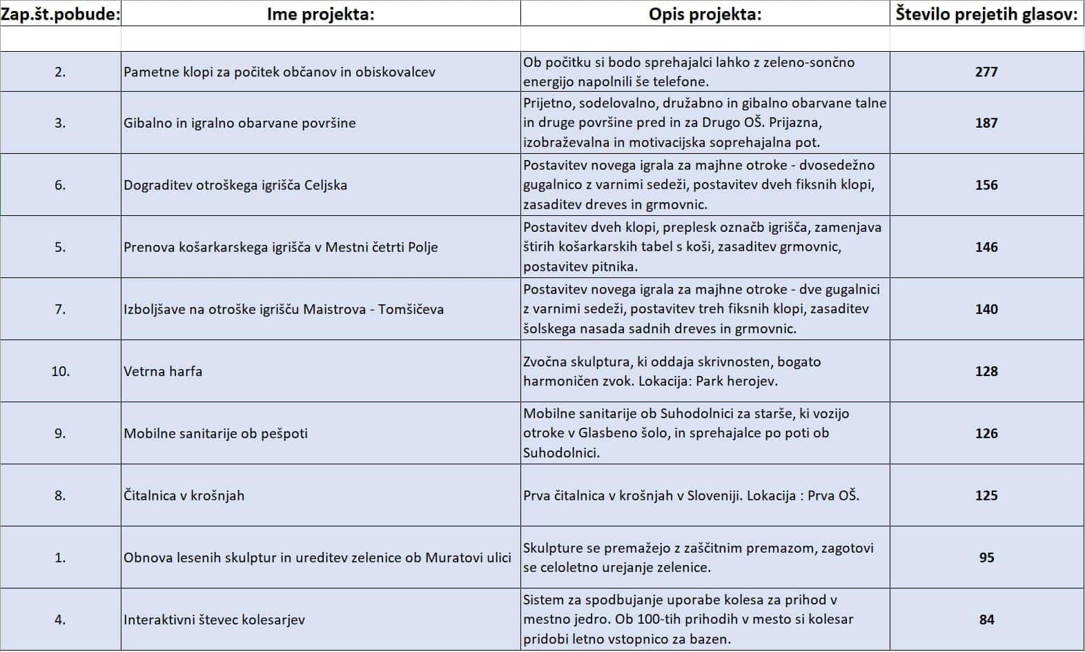 "Objavljamo prve neuradne rezultate glasovanja po volilnih enotah. V vsaki volilni enoti bomo izvedli vsaj prve tri projekte, izvedba ostalih predlaganih projektov pa bo odvisna od njihove dejanske vrednosti. Vsem udeleženkam in udeležencem glasovanja se za sodelovanje iskreno zahvaljujemo, predlagateljem izbranih zmagovalnih projektov pa iskreno čestitamo," je dodal Klugler.
