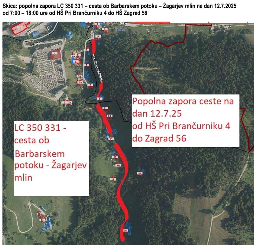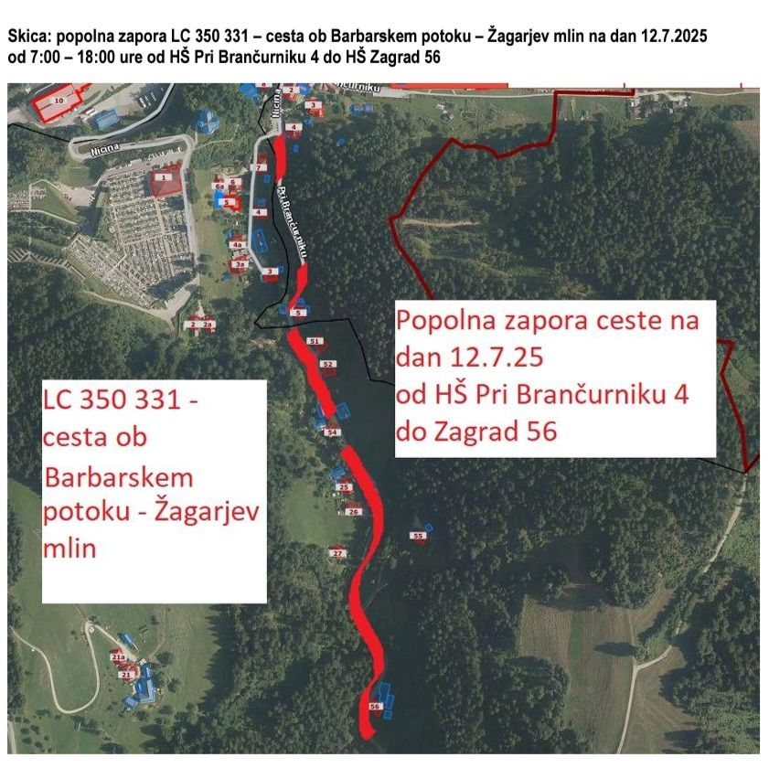 Obveščamo vas, da bo v soboto, 12. julija 2025, med 7.00 in 18.00 uro vzpostavljena popolna zapora občinske ceste v Brančurnikov graben zaradi podiranja nevarnih dreves nad cesto.