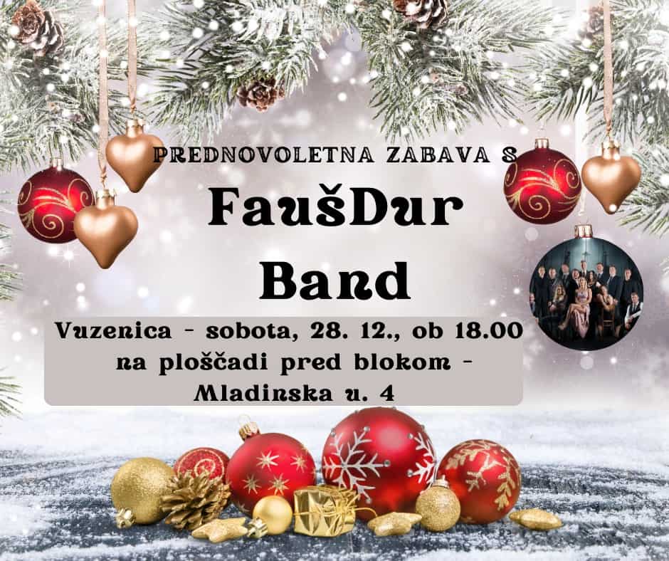 V soboto, 28. decembra 2024, se bo na ploščadi pred blokom Mladinska ulica 4 v Vuzenici odvila nepozabna prednovoletna zabava. Za pravo praznično vzdušje in božične ritme bodo poskrbeli člani priljubljene skupine Faušdur band, ki vedno navdušijo z energijo in odlično glasbo.