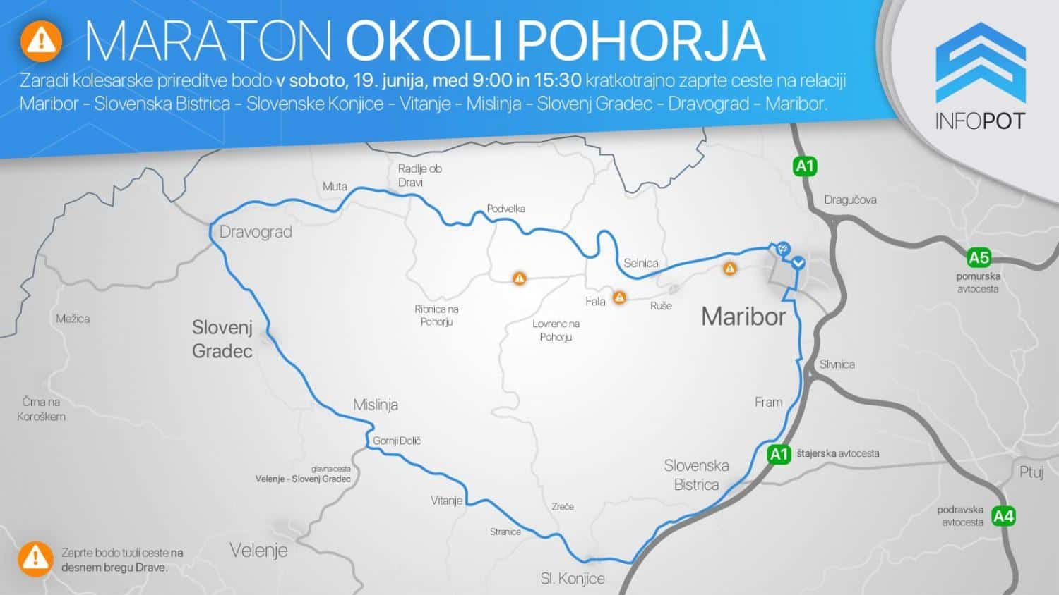 Zaradi kolesarske prireditve bodo v soboto, 19. junija, med 9:00 in 15:30 kratkotrajno zaprte ceste na relaciji Maribor - Slovenska Bistrica - Slovenske Konjice - Vitanje - Mislinja - Slovenj Gradec - Dravograd - Maribor. Zaprte bodo tudi ceste na desnem bregu reke Drave na relaciji Maribor - Ruše - Fala - Puščava - Lehen - Janževski vrh - Podvelka.