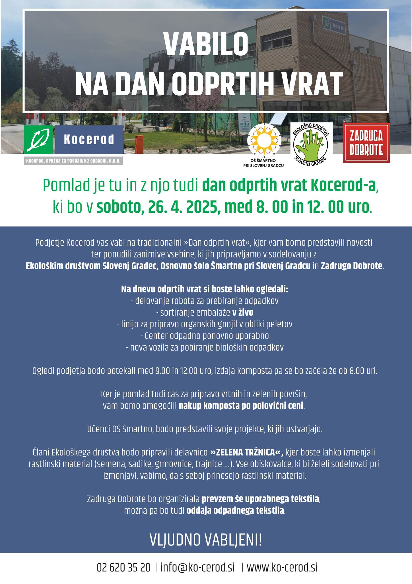 Pomlad je tu in z njo tudi dan odprtih vrat Kocerod-a, ki bo v soboto, 26. aprila 2025, med 8. in 12. uro. »Dan odprtih vrat« organizirajo že tradicionalno.