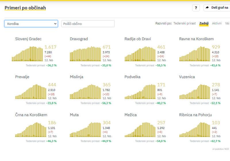 Na Koroškem so včeraj potrdili 174 novih okužb. V Slovenj Gradcu 44, v Dravogradu in Radljah ob Dravi 24, na Ravnah na Koroškem in na Prevaljah 18, v Mislinji 10, v Podvelki 9, v Vuzenici 7 in Črni na Koroškem po 7, na Muti 6, v Mežici 5. v Ribnici na Pohorju pa 2.