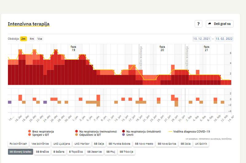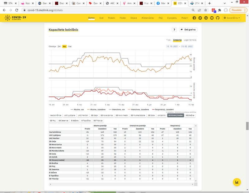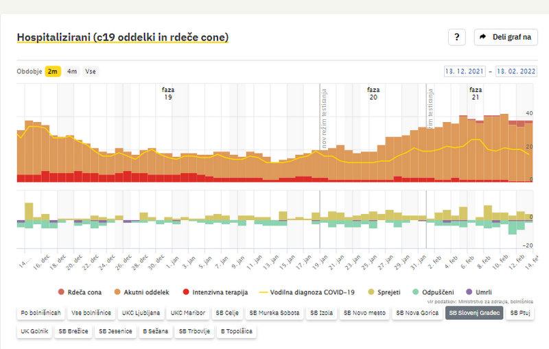 Na navadnih oddelkih je zaradi covida-19 hospitaliziranih 447 bolnikov, na intenzivnih oddelkih pa 111. Skupno število hospitaliziranih s potrjeno okužbo je 987 oz. pet več kot dan prej. Od teh jih je na navadnih oddelkih 407 s covidom-19, na intenzivnih oddelkih pa zdravijo 22 bolnikov s covidom-19. Po podatkih vlade je v soboto umrlo sedem bolnikov s potrjeno koronavirusno okužbo.