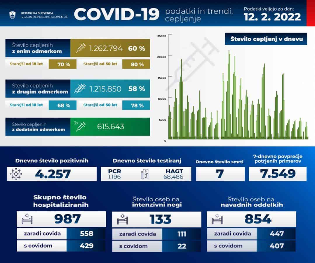 V soboto so v državi ob 1196 PCR-testih in 68.486 hitrih antigenskih testih potrdili 4257 okužb z novim koronavirusom. Dan prej pa so jih ob 3017 PCR-testih in 102.393 hitrih antigenskih testih potrdili 7330.
