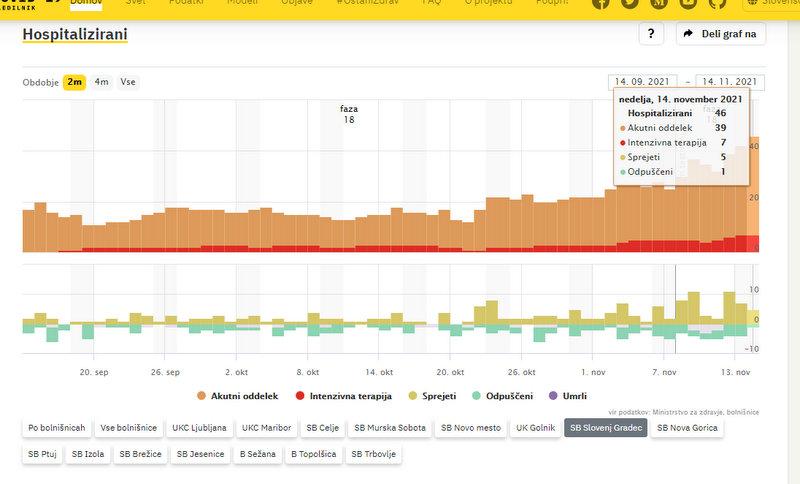 V SB Slovenj Gradec zdravijo 46 covidnoh bolnikov, dan pred tem so jih 42. Intenzivno terapijo potrebuje 7 bolnikov, enako kot dan prej. V bolnišnico so na novo sprejeli 5 oseb, v domačo oskrbo so odpustili 1 osebo.