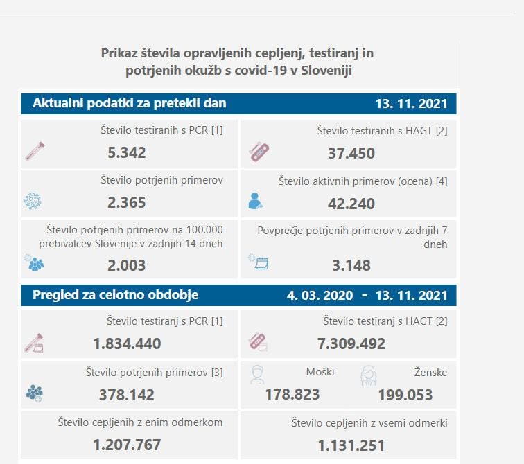 V soboto so v Sloveniji ob 5342 PCR-testih potrdili 2365 okužb z novim koronavirusom, dan pred tem so ob 9205 PCR-testih potrdili 3666 okužb. Delež pozitivnih PCR-testov znaša 44,3 odstotka, dan pred tem 39,8 odstotka. Opravili so tudi 37.450 hitrih antigenskih testov, katerih pozitivne rezultate potrjujejo še s PCR-testiranjem, dan pred tem 70.129.