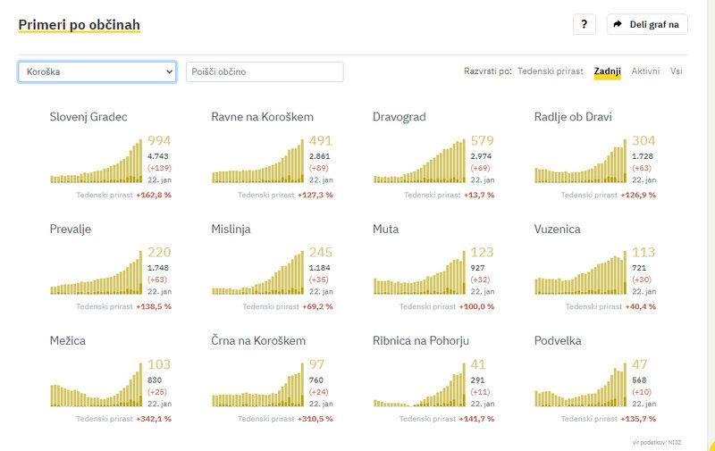 Na Koroškem so včeraj potrdil 580 novih okužb, kar je največ do zdaj v enem dnevu. V Slovenj Gradcu so jih zabeležili 139, na Ravnah na Koroškem 89, v Dravogradu 69, v Radljah ob Dravi 63, na Prevaljah 53, v Mislinji 35, na Muti 32, v Vuzenici 30, v Mežici 25, v Črni na Koroškem 24, v Ribnici na Pohorju 11, v Podvelki pa 10.