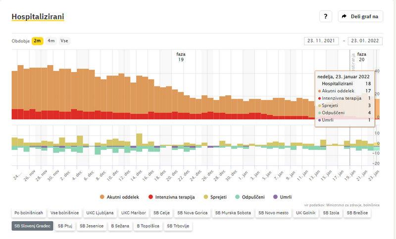 Po zadnjih podatkih vlade v bolnišnicah zdravijo 608 covidnih bolnikov, dan prej 501, od tega 135 na intenzivni negi, dan prej 136. V soboto je umrlo 18 covidnih bolnikov. Po podatkih sledilnika v SB Slovenj Gradec zdravijo 18 covidnih bolnikov. Od teh 1 potrebuje intenzivno zdravljenje. Na novo so v bolnišnico sprejeli 3 osebe, 4 so odpustili v domačo oskrbo, ena oseba je umrla.