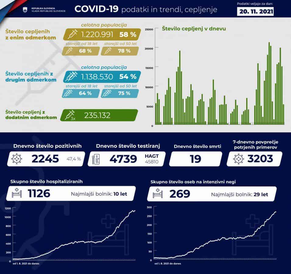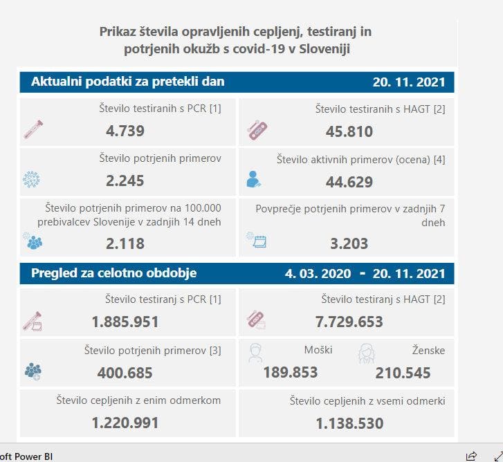 V soboto so v Sloveniji ob 4739 PCR-testih potrdili 2245 okužb z novim koronavirusom, dan pred tem so ob 8127 PCR-testih potrdili 3232 okužb. Delež pozitivnih PCR-testov znaša 47,4 odstotka, dan pred tem 39,8 odstotka. Opravili so tudi 45.810 hitrih antigenskih testov, katerih pozitivne rezultate potrjujejo še s PCR-testiranjem, dan pred tem 85.190.