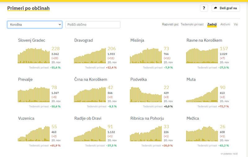 V soboto so na Koroškem potrdili 70 novih okužb, kar je več kot pred tednom dni, ko so jih zabeležili 52. Največ so jih včeraj potrdili v Slovenj Gradcu, in sicer 23, v Dravogradu in v Mislinji po 11, na Ravnah na Koroškem 7, na Prevaljah 5, v Črni na Koroškem in Podvelki po 3, v Vuzenici in na Muti po 2, v Radljah ob Dravi, Ribnici na Pohorju in Mežici pa po 1.
