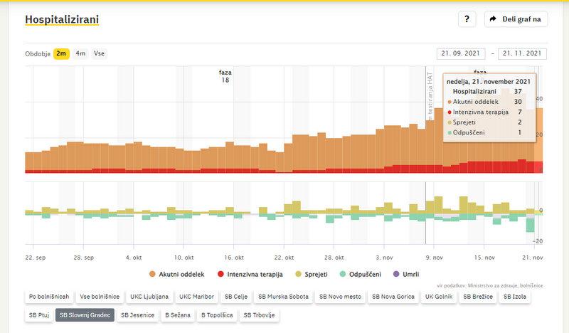 V SB Slovenj Grade zdravijo 37 covidnih bolnikov, od teh jih 7 potrebuje intenzivno zdravljenje. V bolnišnico so na novo sprejeli 2 osebi, eno pa so odpustili v domačo oskrbo.