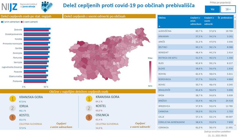 Z enim odmerkom cepiva proti covidu-19 je cepljenih 1.220.991 ljudi ali 58 odstotkov, z drugim odmerkom pa 1.138.530 ali 54 odstotkov. Število cepljenih s poživitvenim odmerkom znaša 235.132.