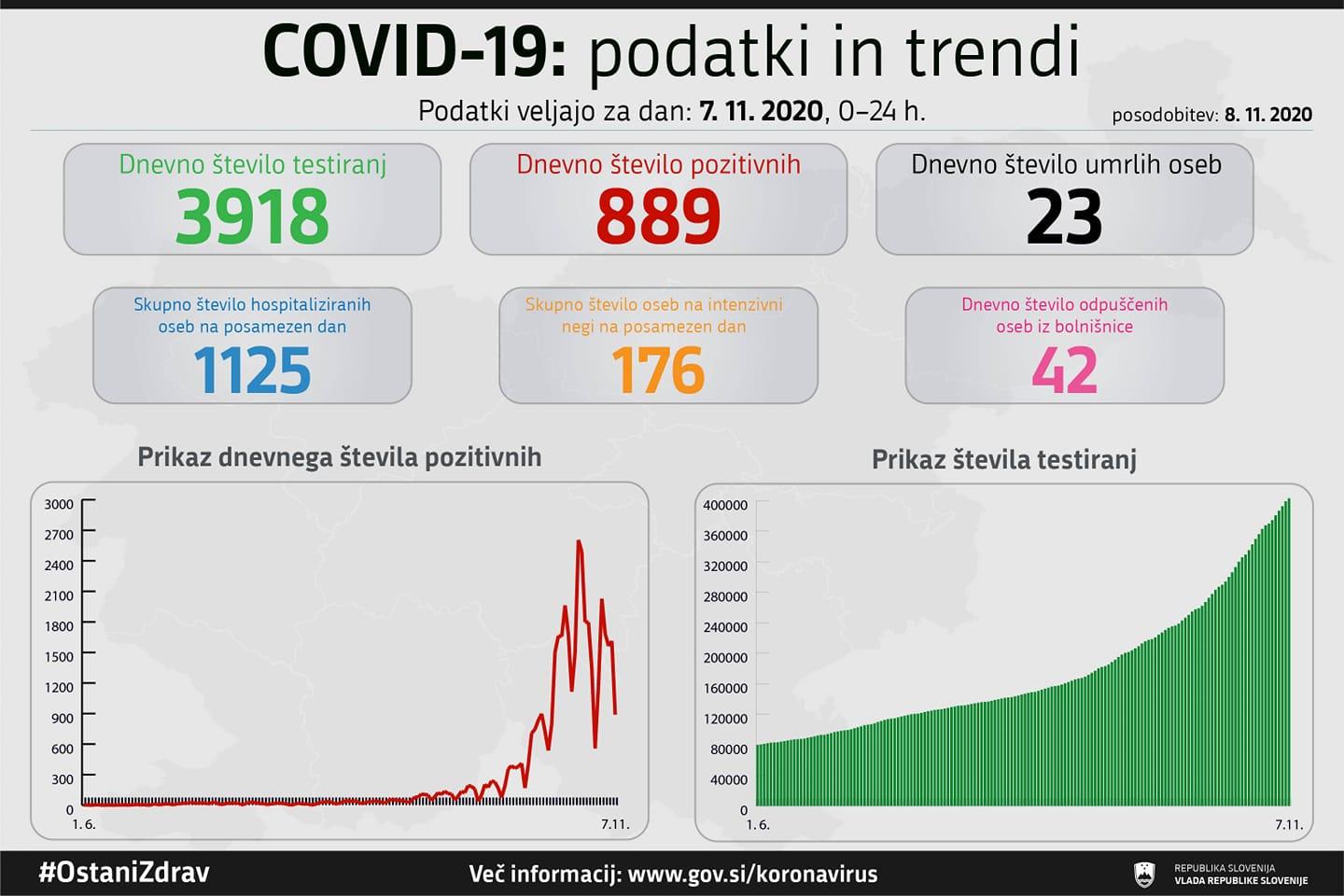 Po podatkih Sledilnika covid-19 je trenutno v Sloveniji aktivno okuženih 22.167 oseb, kar je manj kot v petek, ko jih je bilo 22.979. Povprečno število okuženih v 14 dneh na 100.000 prebivalcev je bilo v soboto 1058, v petek pa 1096.