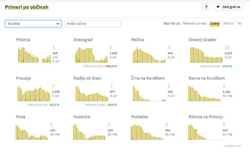 Na Koroškem so včeraj potrdili le eno novo okužbo, in sicer v Mislinji, kar je manj kor pred tednom dni, ko so zabeležili 2. V regiji so v zadnjih sedmih dneh zabeležili 27 novih okužb s koronavirusom. Sedemdnevno povprečje znaša 3,86.