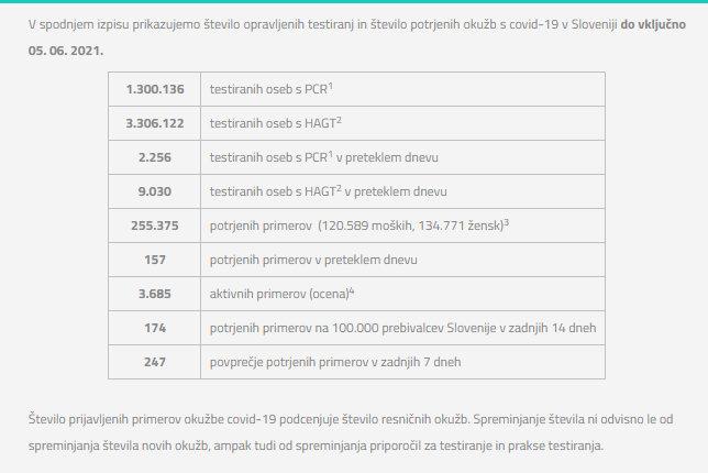 V spodnjem izpisu je prikazano število opravljenih testiranj in število potrjenih okužb s covid-19 v Sloveniji do vključno 05. 06. 2021