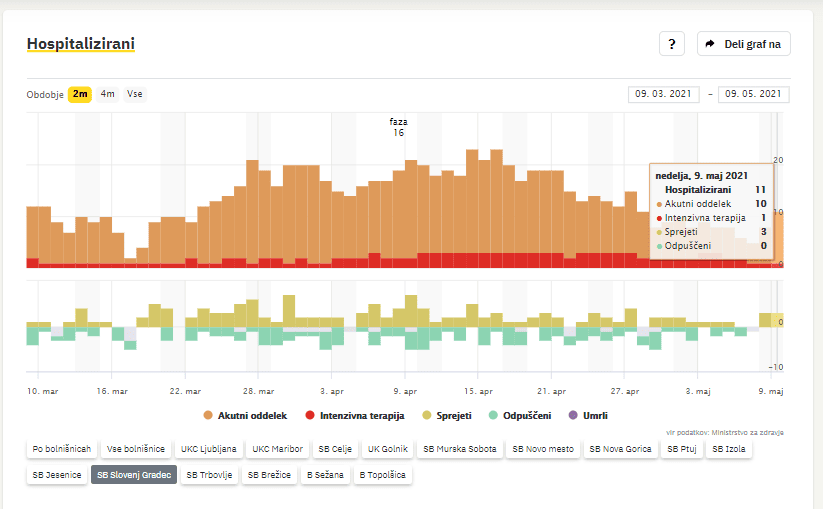 V Splošni bolnišnici Slovenj Gradec se po zadnjih podatkih Covid-19 sledilnika zdravi 11 covidnih bolnikov, eden na oddelku intenzivne terapije. V bolnišnično oskrbo so sprejeli tri bolnike, nihče ni umrl.