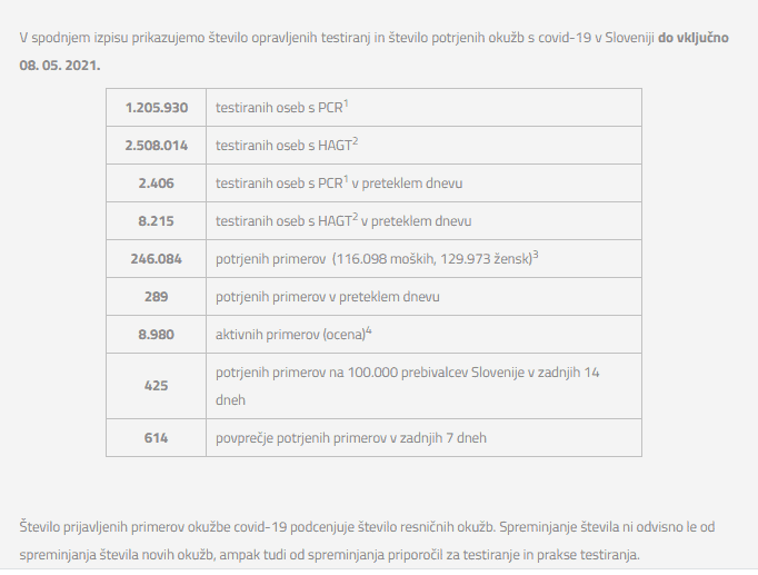 Število opravljenih testiranj in število potrjenih okužb s covidom-19 do vključno 8. 5. 2021: