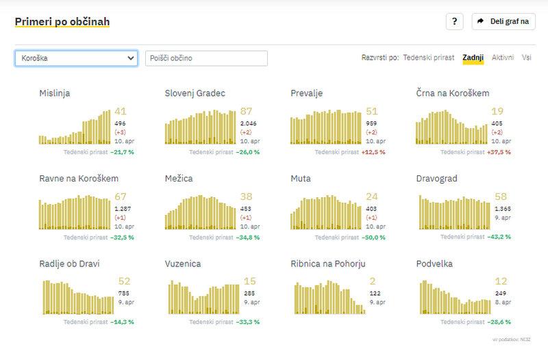 Na Koroškem so nove okužbe zabeležili v sedmih občinah, največ v Mislinji, in sicer 3. Po dve novi okužbi pa so zabeležili v Slovenj Gradcu, na Prevaljah in Črni na Koroškem, po eno pa na Ravnah na Koroškem, v Mežici in na Muti.