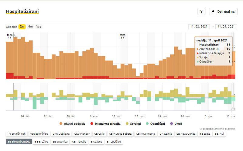 Po podatkih Sledilnika za covid-19 se v Splošni bolnišnici Slovenj Gradec zdravi 18 covidnih bolnikov, intenzivno terapijo potrebujejo trije. Na novo so sprejeli 1 bolnika, v domačo oskrbo pa odpustili 3 osebe.