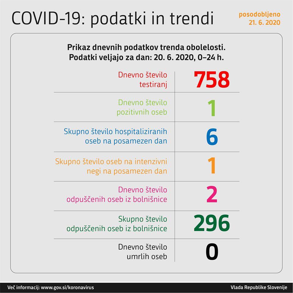 Novo okužbo so potrdili v Velenju. V slovenskih bolnišnicah ostaja hospitaliziranih šest oseb, od tega en pacient leži na intenzivni negi. Skupaj so odpustili 296 bolnikov, včeraj dva. Število vseh pozitivnih primerov doslej znaša 1520, število umrlih pa ostaja 109. Skupno so opravili 92.910 testiranj.