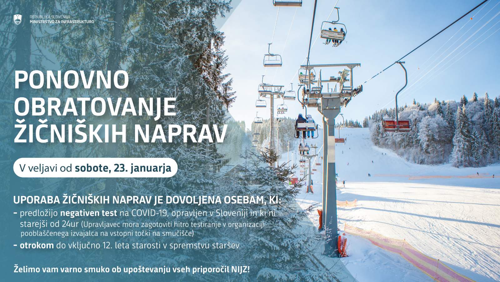 Pri tem naj spomnimo, da je v decembrskem odloku veljalo, da je obratovanje žičniških naprav in njim pripadajočih prog dovoljeno v skladu s priporočili Nacionalnega inštituta za javno zdravje in pod pogojem, da upravljalec naprav zagotovi hitro testiranje v organizaciji pooblaščenega izvajalca na vstopni točki na smučišče.