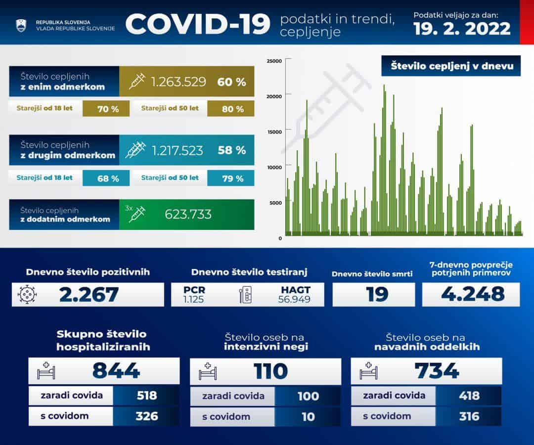 Z enim odmerkom cepiva proti covidu-19 je po podatkih NIJZ cepljenih 1.263.529 ljudi, kar predstavlja 60 odstotkov populacije. Polno cepljenih pa je 1.217.523 oseb, kar predstavlja 58 odstotkov populacije. Poživitveni odmerek je po aktualnih podatkih vlade prejelo 623.733 ljudi.