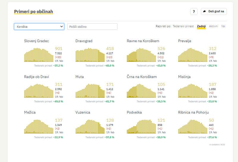 Na Koroškem so včeraj potrdili 86 novih okužb. V Slovenj Gradcu 30, v Dravogradu 13, na Ravnah na Koroškem 11, na Prevaljah 9, v Radljah ob Dravi in na Muti po 6, v Črni na Koroškem 3, v Mislinji, Mežici in Vuzenici po 2, v Podvelk in Ribnici na Pohorju pa po 1.