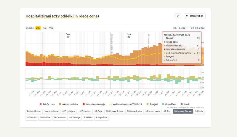 Število hospitaliziranih se je v primerjavi z dnevom prej nekoliko zvišalo. Na navadnih oddelkih je zaradi covida-19 hospitaliziranih 20 bolnikov več kot dan prej, na intenzivnih oddelkih pa zaradi covida-19 zdravijo tri bolnike več kot prejšnji dan.