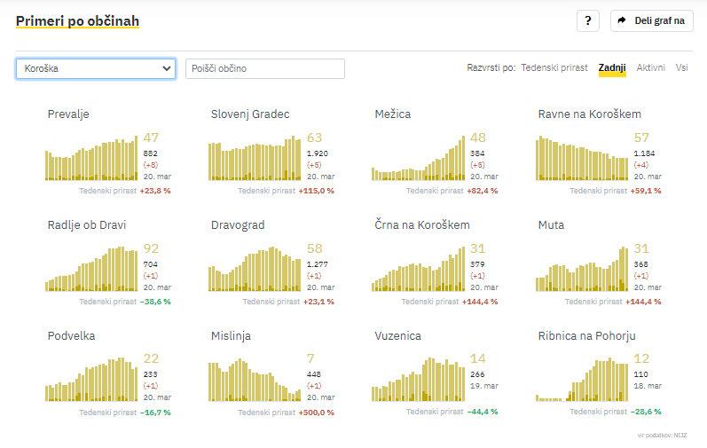 Na Koroškem so v soboto največ novih okužb potrdili na Prevaljah, in sicer 8, v Slovenj Gradcu in v Mežici po 5, na Ravnah na Koroškem 4, v Radljah ob Dravi, Dravogradu, Črni na Koroškem, Podvelki, Mislinji in na Muti pa po 1 novo okužbo. Skupaj torej 28, pred tednom dni so jih potrdili 9.