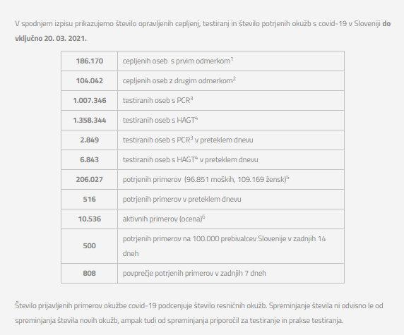 Število opravljenih cepljenj, testiranj in število potrjenih okužb s covid-19 v Sloveniji do vključno 20. 03. 2021.