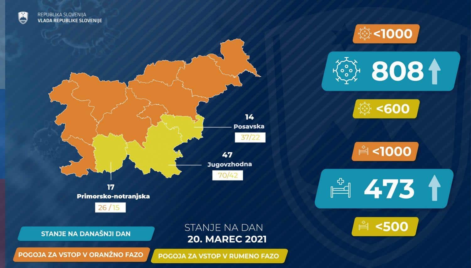V zadnjih sedmih dneh so na Koroškem potrdili skupno 272 novih okužb, na dan povprečno 38,86. Kar pomeni, da Koroška glede na vladni semafor sproščanja ukrepov že tretji dan zapored ne izpolnjuje več pogojev za oranžno fazo, saj je sedemdnevno povprečje okužb višje od 34. Slovenija je na državni ravni še vedno v oranžni fazi sproščanja ukrepov, pogoji za prehod v rumeno fazo še namreč niso izpolnjeni.
