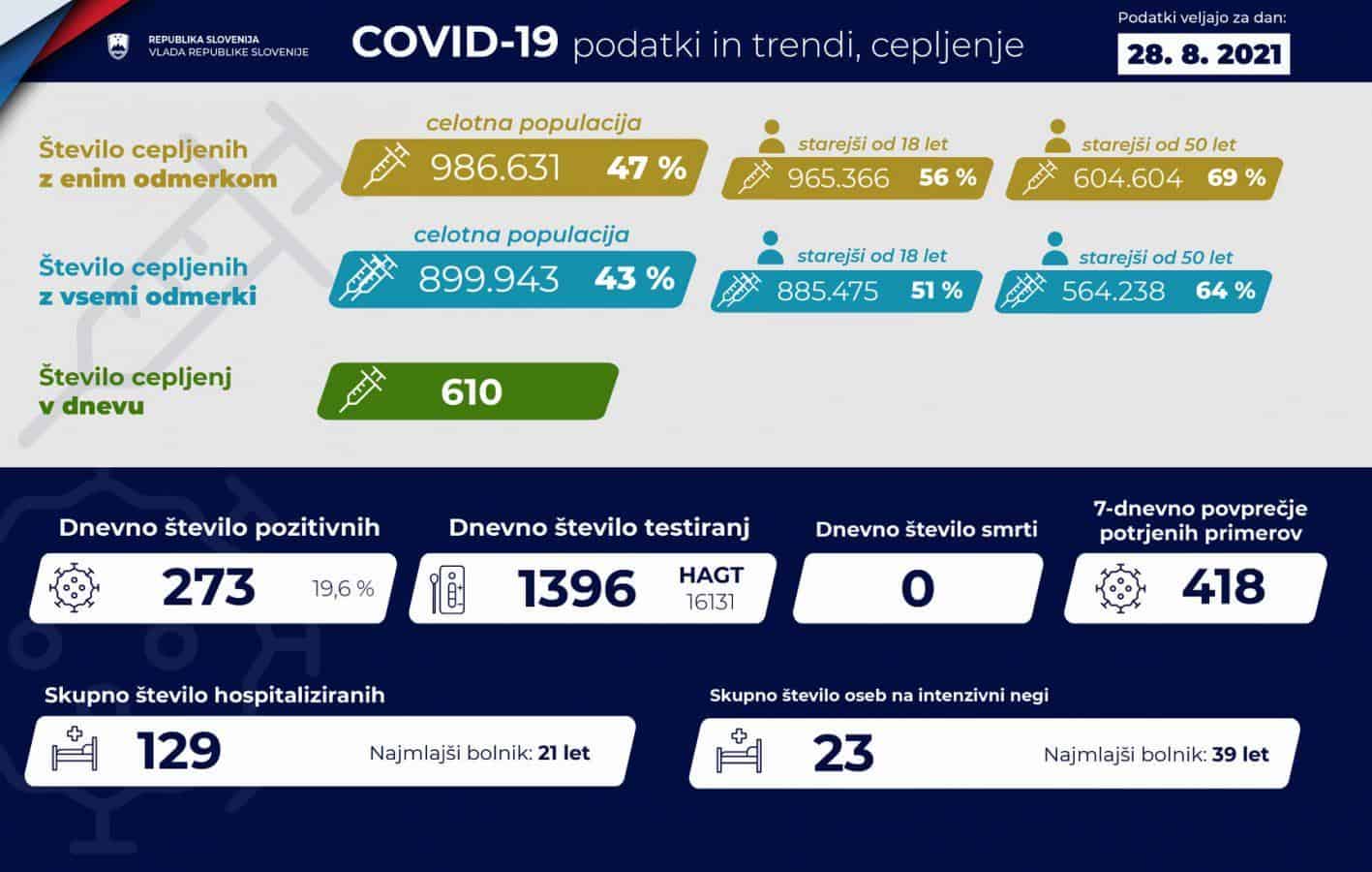 V Sloveniji je z enim odmerkom cepiva proti covidu-19 cepljenih 986.631 oseb, kar predstavlja 47 odstotkov vseh prebivalcev. Med starejšimi od 18 let je z enim odmerkom cepljenih 56 odstotkov, med starejšimi od 50 pa 69 odstotkov.