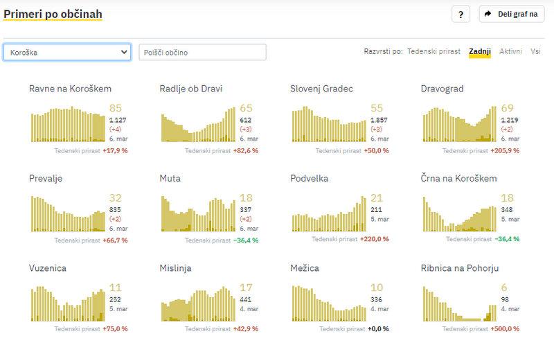 Na Koroškem so največ novih okužb zabeležili na Ravnah na Koroškem, in sicer 4, v Radljah ob Dravi in Slovenj Gradcu po 3, v Dravogradu, na Prevaljah in na Muti pa po 2.
