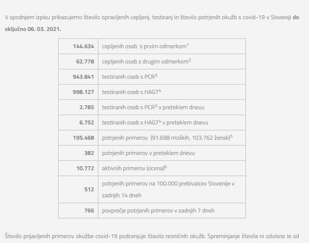 Število opravljenih cepljenj, testiranj in število potrjenih okužb s covid-19 v Sloveniji do vključno 06. 03. 2021.