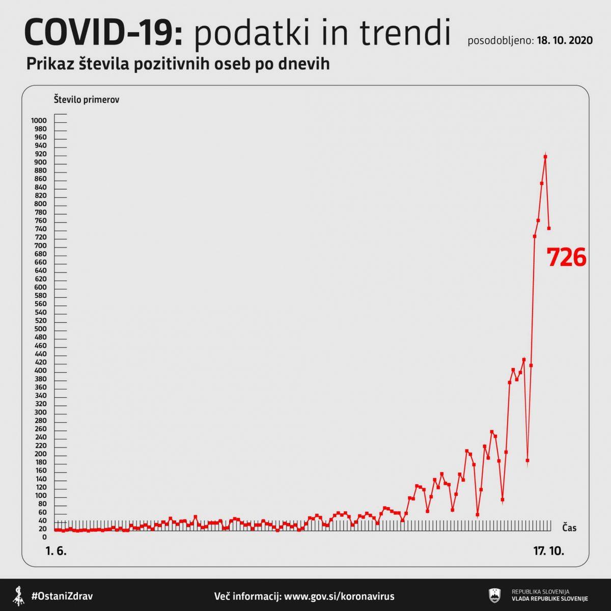 Vladni govorec Jelko Kacin je preko Twitterja sporočil, da so včeraj v Sloveniji ob 3765 testiranjih potrdili 726 novih okužb s koronavirusom.