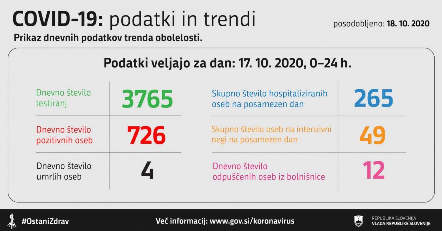 Trend obolelosti s koronavirusom v Sloveniji in podatki za dan 17. 10. 2020 (00:00–24:00):