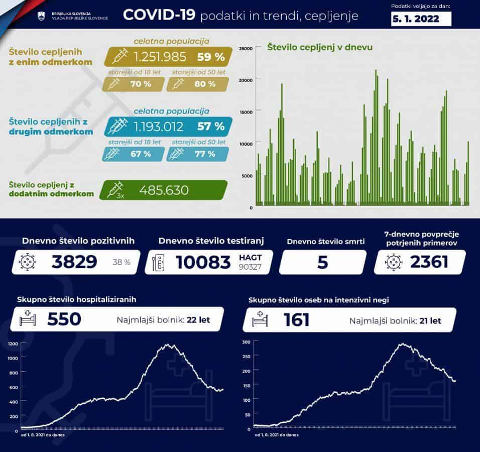 V sredo so v Sloveniji ob opravljenih 10.083 PCR-testih potrdili 3829 okužb z novim koronavirusom, dan pred tem so ob opravljenih 10.577 PCR-testih potrdili 4068 okužb. Delež pozitivnih PCR-testov je bil 38-odstoten, dan pred tem 38,5-odstoten. Opravili so tudi 90.327 hitrih testov, katerih pozitivne rezultate preverjajo še s PCR-testi, dan pred tem 82.633.