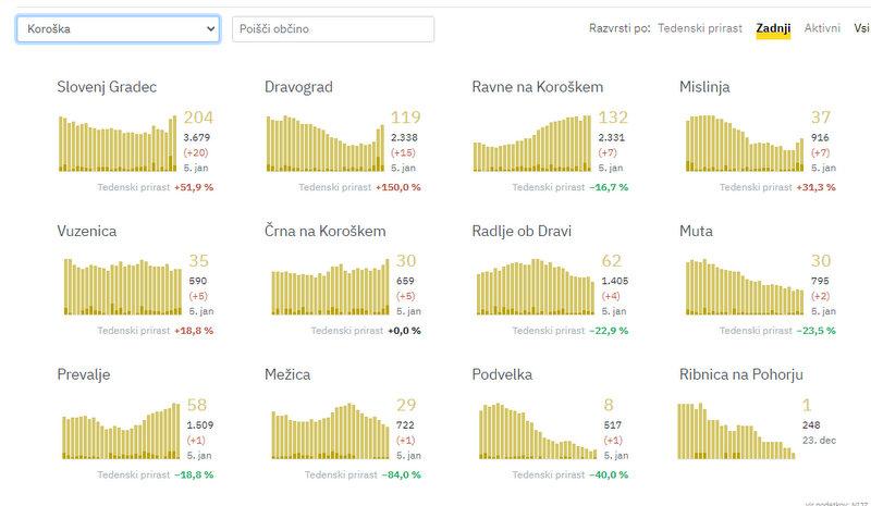 Na Koroškem so včeraj potrdili 68 novih okužb, dan prej 143, pred tednom dni 67. V Slovenj Gradcu so jih potrdili 20, v Dravogradu 15, na Ravnah na koroškem in v Mislinji po 7, v Vuzenici in Črni na Koroškem po 5, v Radljah ob Dravi 4, na Muti 2, na Prevaljah, v Mežici in Podvelki pa po 1.