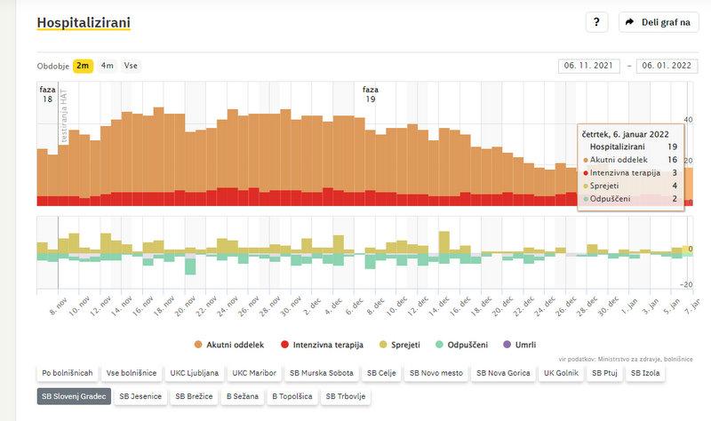Po podatkih sledilnika v SB Slovenj Gradec zdravijo 19 covidnih bolnikov. Od teh 3 potrebujejo intenzivno zdravljenje. V domačo oskrbo so odpustili 2 osebi, 4 pa so na novo sprejeli v bolnišnico.