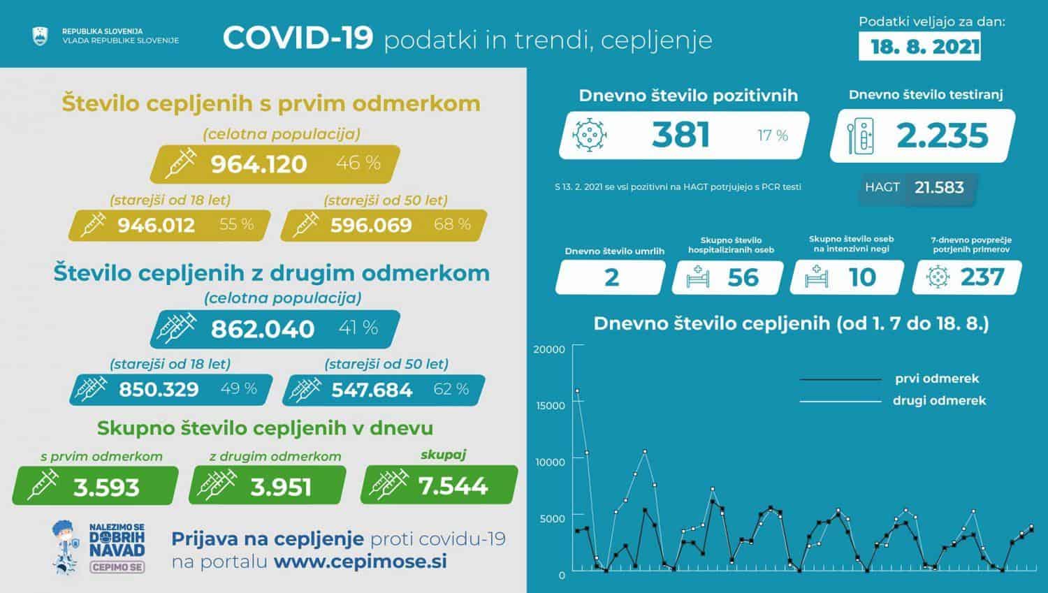 V slovenskih bolnišnicah se zdravi 56 covidnih bolnikov, en manj kot dan prej. Na enotah intenzivne terapije se zdravi 10 covidnih bolnikov, en več kot dan prej. V sredo sta umrla dva covidna bolnika.
