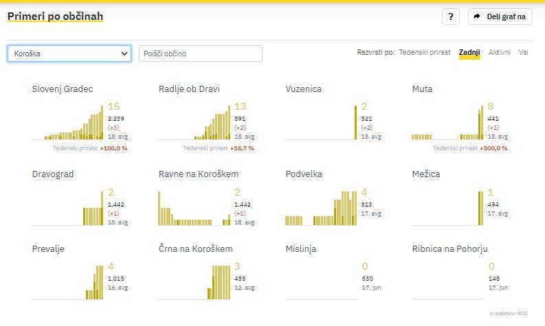 Na Koroškem so včeraj zabeležili deset novih okužb, in sicer tri v Slovenj Gradcu, dve v Radljah ob Dravi in Vuzenici, po eno pa na Muti, na Ravnah na Koroškem in v Dravogradu. V zadnjih sedmih dneh so v regiji potrdili 42 okužb, tako povprečje potrjenih primerov znaša 6.