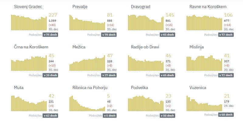 Na Koroškem so največ novih okužb zabeležili v MO Slovenj Gradec, in sicer 40, na Prevaljah 16, v Dravogradu 15, na Ravnah na Koroškem 14, v Črni na Koroškem 10, v Mežici, Radljah ob Dravi in v Mislinji po 8, na Muti 5, v Ribnici na Pohorju 2, v Podvelki 1.