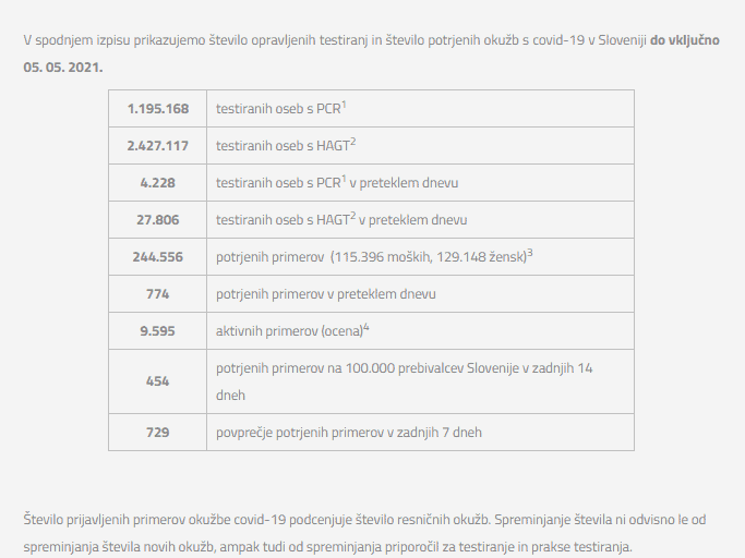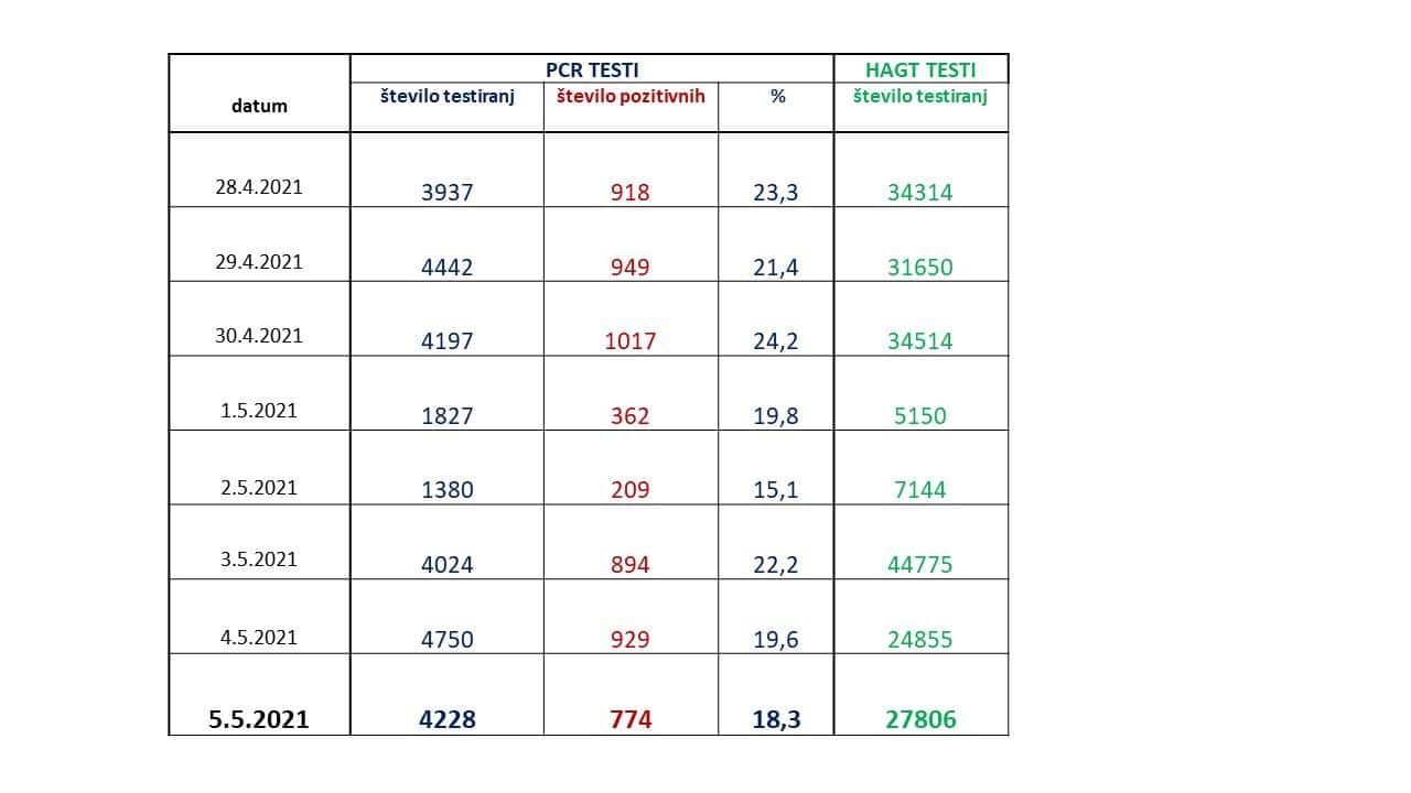 Včeraj je bilo opravljenih 4.228 PCR testiranj in 27.806 hitrih antigenskih testov. S PCR testi je bilo včeraj potrjenih 774 novih okužb.