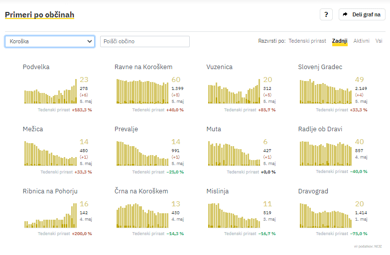 Podvelka 6, Ravne na Koroškem 5, Vuzenica 5, Slovenj Gradec 4, Mežica 1, Prevalje 1, Muta 1.