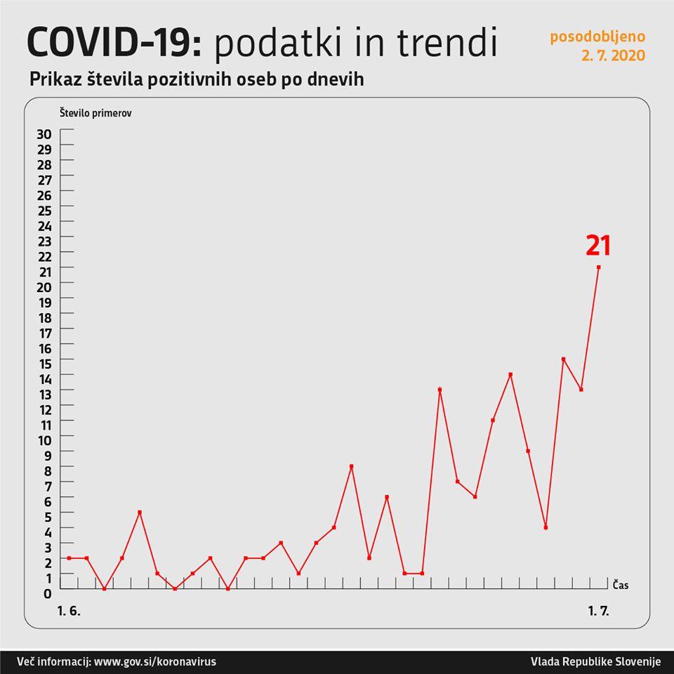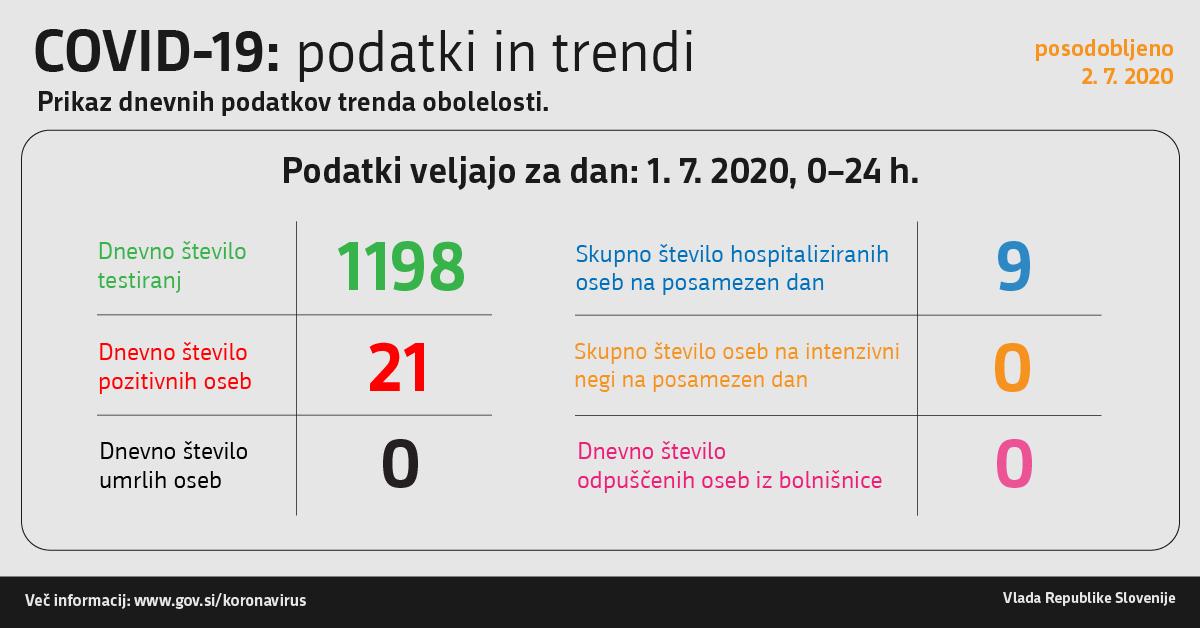 Trend obolelosti s koronavirusom v Sloveniji na dan 1. 7. 2020 (00:00-24:00):