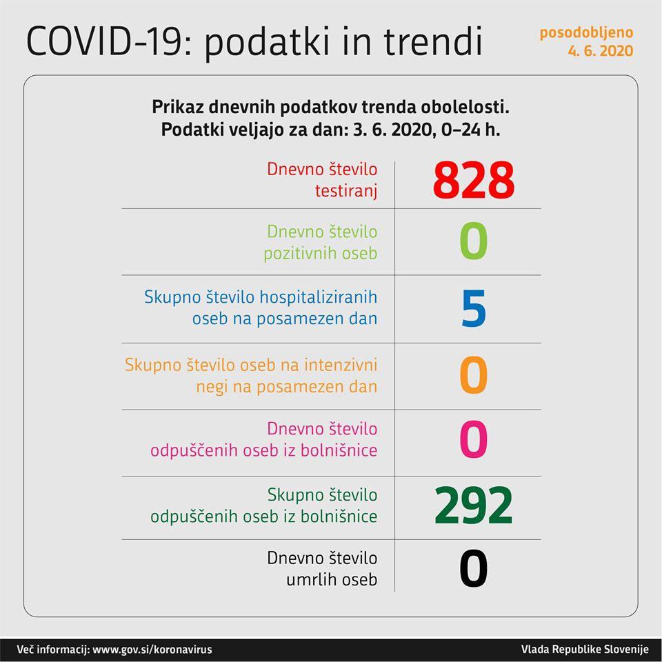 Trend obolelosti s koronavirusom v Sloveniji in podatki za dan 3. 6. 2020 (00:00–24:00):